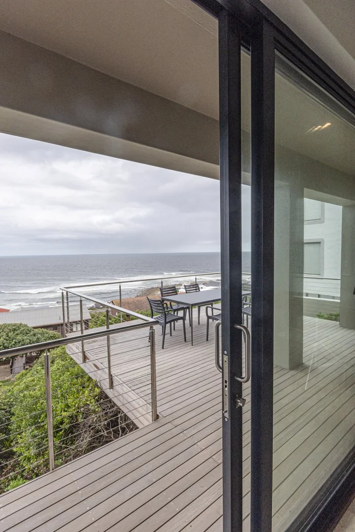 Outdoor balcony overlooking the ocean with a dining table, six chairs, and a barbecue. Perfect for watching the sunset or sunrise or a braai.
